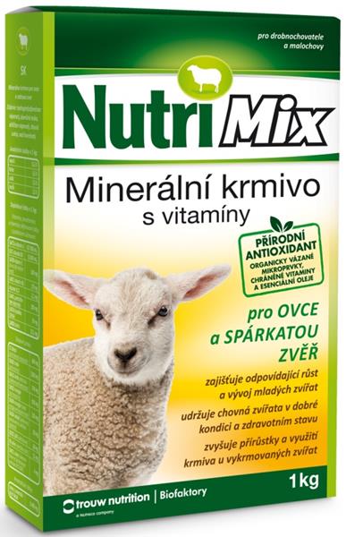 PROBLÉM Nedostatečná nebo nevyvážená krmná dávka pro ovce nebo spárkatou zvěř v odchovu nebo ve výkrmu má za následek snížené přírůstky, nižší využitelnost krmiva, menší životaschopnost a horší zdravotní stav. ŘEŠENÍ Nutrimix pro ovce a spárkatou zvěř je určen na doplnění minerálních látek a potřebných vitaminů do krmných dávek zvířat chovaných v drobnochovech nebo oborách. Přispívá k udržení dobrého zdravotního stavu a životaschopnosti mláďat. Je určen ke každodennímu doplňování méně hodnotných krmiv. SLOŽENÍ v 1 kg: vápník 155 g, fosfor 65 g, sodík 55 g, hořčík 25 g, vitamin A 427 500 m.j., vitamin D3 55 000 m.j., vitamin E 300 mg, železo 690 mg, zinek 2 860 mg (z toho organická vazba 570 mg), mangan 1 140 mg (z toho organická vazba 230 mg), jod 60 mg, kobalt 20 mg, selen 15 mg (z toho organická vazba 4 mg), přírodní antioxidant 300 mg, esenciální oleje 3100 mg. ZPŮSOB APLIKACE Odměřené množství přípravku se rovnoměrně zamíchá do krmné dávky (jádra) nebo se rovnoměrně nasype do žlabu na píci. Na počátku odchovu a výkrmu je vhodné používat dolní hranici doporučeného dávkování a postupně zvyšovat podle rostoucí hmotnosti a stáří zvířat. je nutné zajistit trvalý přístup k zdravotně nezávadné vodě. DÁVKOVÁNÍ Jehňata: 5 - 10 g/ 1 kus/ den (1 vrchovatá čajová lžička) Dospělá zvířata: 10 - 20 g/ 1 kus/ den (2 - 3 vrchovaté čajové lžičky) Březí a laktující samice: 15 - 30 g/ 1 kus/ den (2,5 - 4 vrchovaté čajové lžičky) (1 plná čajová lžíce – cca 10 g) Doporučená krmná dávka pro ovci (2 jehňata) na začátku laktace: 1,5 kg sena; 1,3 kg okopanin (brambory, krmná řepa); 0,3 kg obilovin (ovesný šrot, pšeničné otruby, ječmen, aj.); 0,4 kg bílkovinných krmiv (hrách, sójový nebo řepkový šrot); 30 g Nutrimixu.