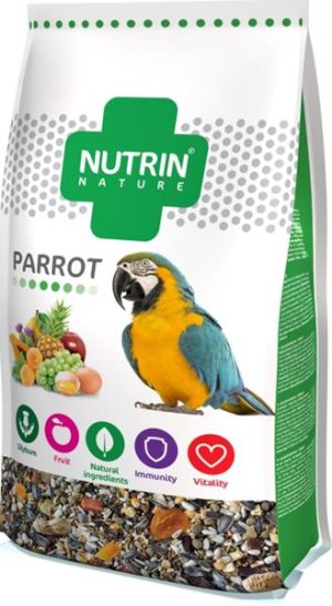 Krmivo Nutrin Nature pro papoušky je chutná směs s obsahem min. 20 % ovoce pro střední a velké papoušky. Ovoce (jablka, papája, ananas, meruňky, rozinky,..) krmivu dodává nejen jedinečnou vůni a chuť, ale cenné jsou především jeho dietetické vlastnosti a významné hladiny biologicky aktivních látek. Konopné semínko, len, světlice, slunečnice a ostropestřec jsou zdrojem nenasycených mastných kyselin pro zdraví kůže a peří. Prebiotika podporují správnou funkci střev a imunitního systému. Krmivo je bez obsahu barviv, konzervantů a umělých zchutňovadel. Složení: Semena (z toho ostropestřec min. 2 %), obiloviny, ovoce (min. 20 %), vedlejší výrobky rostlinného původu (FOS - čekankový inulin 320 mg/kg, Yucca schidigera 160 mg/kg), bílkovinné extrakty rostlinného původu, kvasnice, minerální látky, oleje a tuky, řasy, vejce a výrobky z vajec. Doplňkové látky na 1 kg: Vitaminy: vitamin A 2 100 m.j., vitamin D3 200 m.j., vitamin E 50 mg. Aminokyseliny: L-lysin 480 mg, DL-methionin 320 mg. Emulgátory: Lecitin 800 mg. Analytické složky: Hrubý protein 13 %, hrubé oleje a tuky 13 %, hrubá vláknina 13 %, obsah anorganických látek 3 %. Krmný návod: Krmte dle potřeby. Možné doplňovat o zelené krmivo, čerstvé ovoce a zeleninu. Zbytky krmiv odstraňujte. Zajistěte neomezený přístup k pitné vodě.