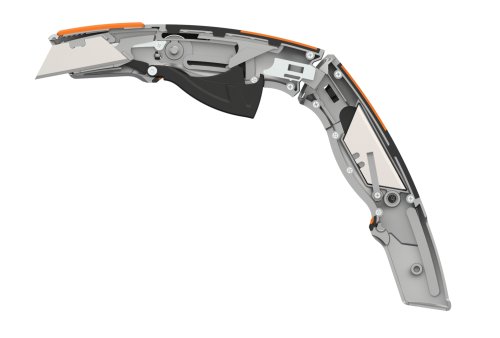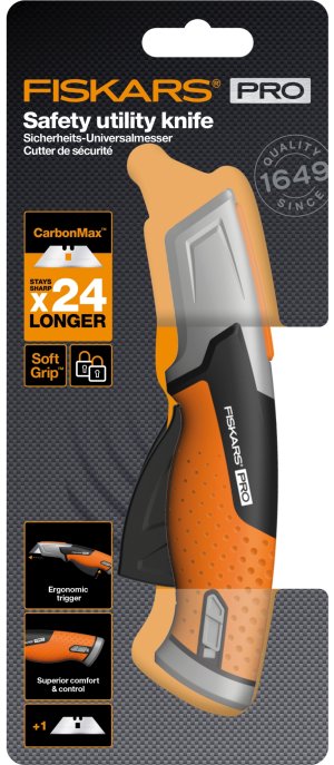 Nůž je vybaven automaticky zatahovací čepelí pro maximální bezpečnost. Má ergonomickou, texturovanou rukojeť pro neklouzavé zabezpečení a pohodlí v ruce. Zesílený kovový konec poskytuje spolehlivou odolnost proti nárazům a pádům. Nůž má celokovovou konstrukci pro trvalou odolnost. Má jednu čepel z uhlíku CarbonMax s povrchovou úpravou pro zachování ostrosti, která vydrží 24x déle než standardní čepele.