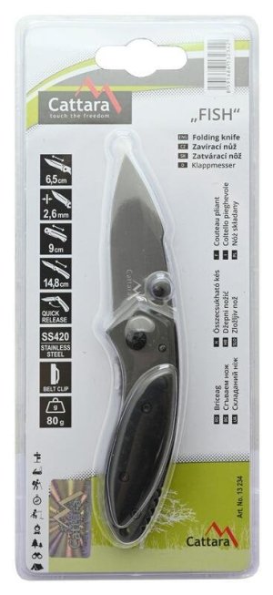 Kompaktní a lehký zavírací nůž Cattara FISH využijete při stanování, na túrách, při rybaření, na výletech do přírody i doma na zahradě. Ve spodní části rukojeti se nachází bezpečnostní pojistka, kterou ovládáte bočním posuvem palce. Díky tomu se vám nůže nezavře v nevhodnou chvíli. Na zadní části rukojeti najdete praktický klips, pomocí kterého si můžete nůž zavěsit za opasek nebo kapsu.