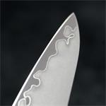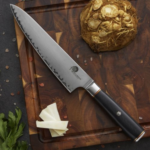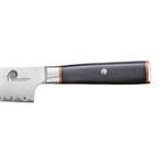 Pořiďte si opravdu kvalitní nůž v japonském stylu. Jeho jádro tvoří 2 vrstvy nerezové oceli rozdílných tvrdostí. Díky těmto vrstvám je nůž mimořádně odolný. Čepel v matném odstínu (takzvaný stonewashed) zdobí úchvatné broušení. Tato úprava skryje škrábance. Jelikož je nůž mimořádně ostrý, zachovají si krájené potraviny svůj tvar a strukturu.