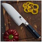 Santoku znamená „tři ctnosti“ – krájení, sekání a drcení. Tento nůž si poradí se všemi typy potravin včetně masa, zeleniny a ryb. Čepel typu Sheepsfoot s tupým hřbetem je navržena pro maximální bezpečnost a kontrolu při jemné práci. Skvělou manipulaci podpoří i možnost opření prstu o horní část čepele.