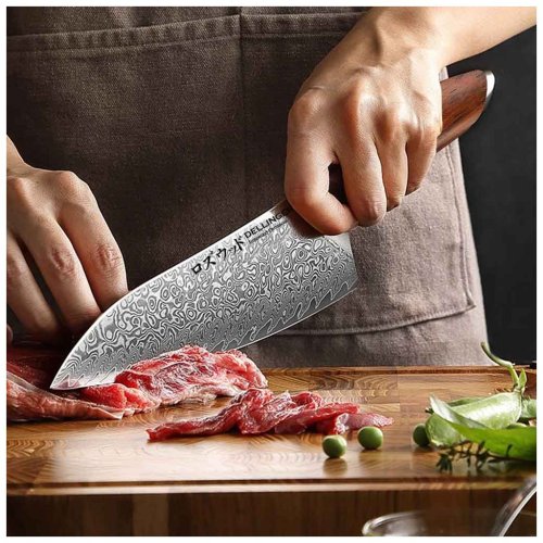 Rukojeť ze vzácného dřeva Rose-Wood zaručuje stabilitu a pohodlí při krájení. Její ergonomický tvar skvěle padne do ruky pravákům i levákům. Ozdobný nýtek podtrhuje precizní ruční zpracování. Spojení luxusního dřeva a damascénské čepele dělá z nože skutečný klenot kuchyně.