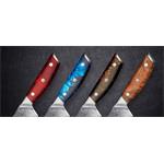 Pokud máte rádi originalitu, u tohoto nože je zaručená. Design rukojeti je opravdu jedinečný u každého kusu. Rukojeť se vyrábí z překrásné epoxidové pryskyřice. Jedná se o průhlednou pryskyřici probarvenou alkoholovými pigmenty. Pryskyřice je voděodolná a zcela bez zápachu. Časem se může stát, že se začne měnit barva. O pevné spojení damaškové oceli a rukojeti se postará také trojité nýtování. Tvar rukojeti je vhodný pro asijský úchop nože.