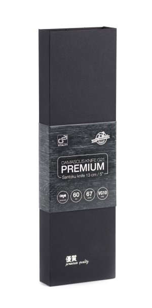 Luxusní nůž G21 Damascus Premium Santoku o délce 13 cm z damascénské oceli využijete při porcování a krájení. Díky výšce čepele můžete nakrájené suroviny přenášet rovnou na pánev nebo do hrnce.