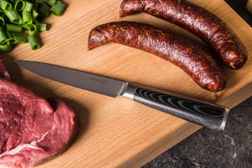 Rukojeť je vyrobena z extra pevného a odolného laminátového materiálu, nazývaného Micarta. Micartu tvoří plátno nebo skelná tkanina s termostatickou pryskyřicí. Výsledkem je pevná, houževnatá rukojeť, která nepodléhá zkáze času. Hladké, rovné, čisté linie tohoto nože se stanou ozdobou každé kuchyně.