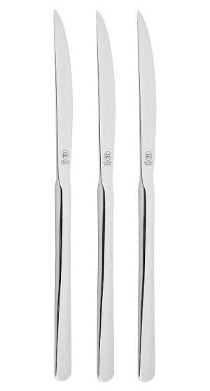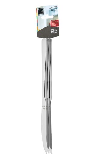 Sada tří kusů příborových nožů CS Solingen EDLON zaujme kvalitním zpracováním z nerezové oceli ve vysoké kvalitě 18/10. Tyto nože jsou opatřeny ostřím s jemnou pilkou, díky níž skvěle poslouží jako univerzální příborové nože. Povrch nožů je lesklý a bez zdobení, s malým tradičním logem značky CS Solingen. Délka každého nože je 22,5 cm.