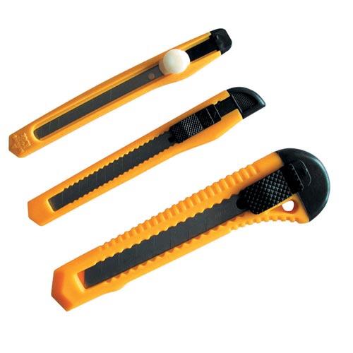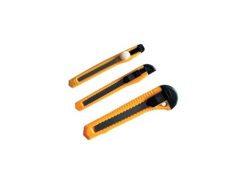 Sada odlamovacích nožů, které jsou praktickým pomocníkem v dílně i domácnosti, ideální pro bezpečné řezání a krájení. Hrot nože se dá snadno zasunout a zajistit pojistkou proti nechtěnému vysunutí.