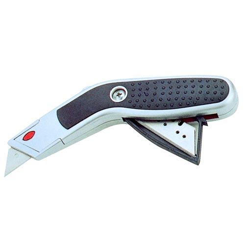 Kovový nůž s výsuvnou lichoběžníkovou čepelí - ergonomický tvar s pogumovanou rukojetí - výklopný zásobník na náhradní čepele Čepel je uchycena uvnitř těla nože na posuvném jezdci.