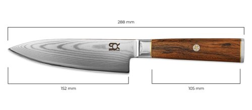 Kuchařský nůž z řady Cocobolo White Damascus od značky SOK se stane nepostradatelným pomocníkem každého kuchaře. Potěší vás svým všestranným využitím. Hřbet a ostří nože se zužují do špičky, takže se perfektně hodí pro porcování a krájení masa a ryb, plátkování a čištění ovoce a zeleniny. Také ho využijete pro zpracování bylinek a ořechů.