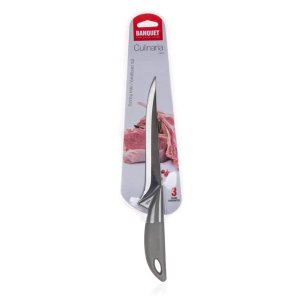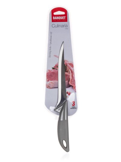 Vykošťovací nůž CULINARIA Grey. Ocelové nože patří mezi nepostradatelné pomocníky v každé kuchyni. Výběr vhodného nože nám usnadní krájení či porcování potravin. Kolekce nožů BANQUET nabízí široký výběr nožů mnoha tvarů, velikostí a účelu použití.