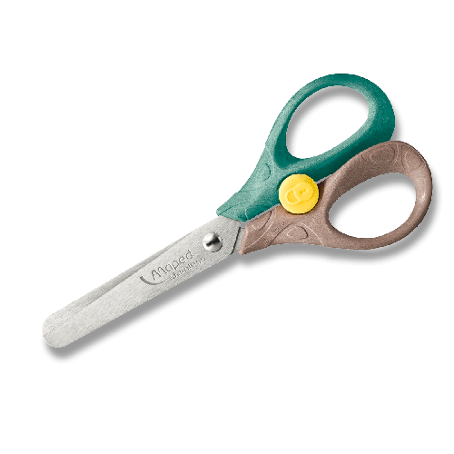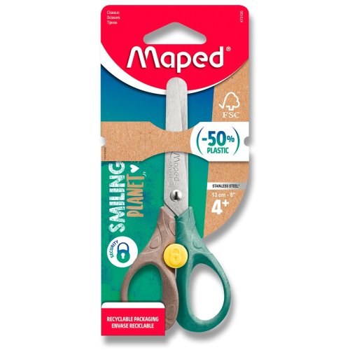 Školní nůžky Maped Smiling Planet Security velikosti 13 cm mají čepele vyrobené z broušené nerezové oceli.