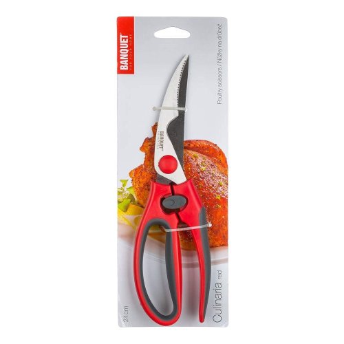 Nůžky na drůbež CULINARIA 24 cm jsou vybaveny zahnutým ostřím pro snadnou manipulaci a rychlé porcování drůbeže. Nůžky jsou vyrobeny z oceli, ergonomické rukojeti jsou z plastu v červené barvě.