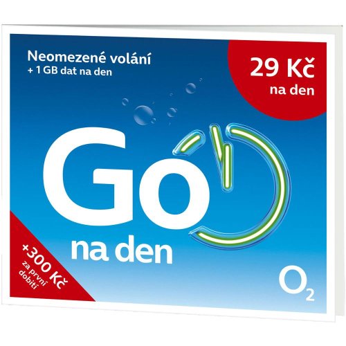 Go na den / 49Kč *Propozice na jeden den: 1GB dat a neomezené volání do všech sítí v ČR jen za 29 Kč na den *Koncová cena vč. DPH: 49 Kč *Kredit: 50 Kč *SMS za 1,90 Kč *Denní okno za 29Kč na den se aktivuje zavoláním nebo datováním a je platné do půlnoci BONUS: Při prvním dobití minimálně 300Kč zákazník získá bonusový kredit 300 Kč *Zákazník platí jenom ty dny, kdy telefonuje nebo se připojí k internetu *Po vyčerpání 1 GB se zákazníkovi automaticky obnoví 300 MB dat za 19 Kč do konce dne