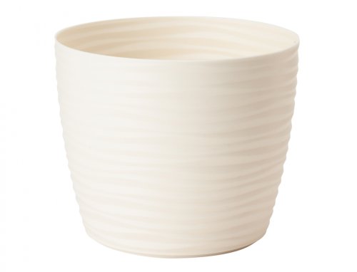 Matný plastový obal na květník s jemnými vlnkami po celém obvodu. Truhlík se díky své přírodní barvě hodí do moderních interiérů. Rozměry: průměr 19 cm, výška 16 cm. Barva: béžová.