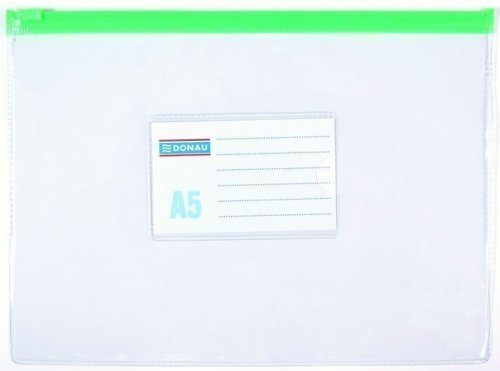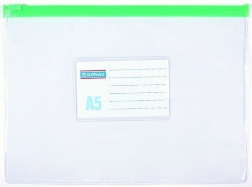 Obálka formátu A5 s plastovým zipem vhodná pro organizaci a ochranu drobných dokladů. Transparentní pevný obal s odolného PVC (170 µm). Barevný plastový zip umístěn na delší straně. Praktický vyměnitelný štítek na vnější straně. Rozměr: 180x240 mm.