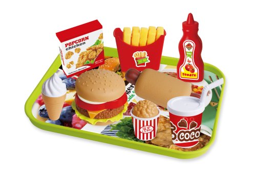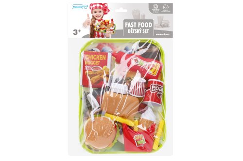 Občerstvení Fast Food s táckem. Součástí tácek, hamburger, hranolky, párek v rohlíku, zmrzlina, nápoj, kečup, kuřecí nugety, vidlička, nůž.