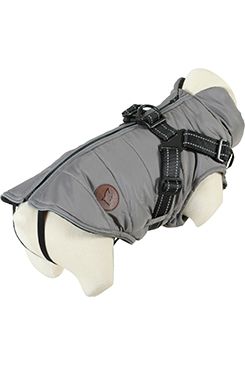Praktická péřová bunda pro psy s integrovaným postrojem pro větší pohodlí a bezpečnost.