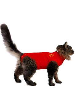 Červené oblečky jsou speciálně vyvinuty pro kočky a mají užší otvor na krk a prostornější část pod ocasem, která umožňuje použití záchodku, zatímco má kočka obleček