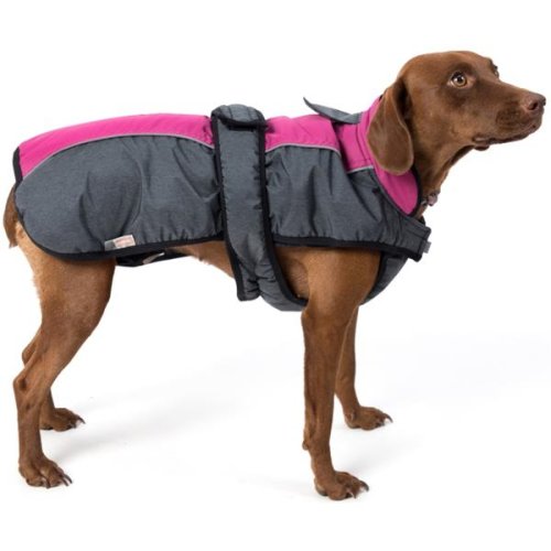 Zimní vesta Esmé LUX XL je určena psům s větším obvodem hrudníku. Svrchní vrstva z bundové tkaniny s voděodolným zátěrem je zateplená vafixem a podšitá měkkým flanelfleecem, který nezacuchává srst. Obleček je tvarovaný tak, aby psa neomezoval v pohybu, a přitom chránil všechny důležité partie jeho těla před chladem, větrem, deštěm i sněhem. Zateplený stojáček kryje šíji, gumičky na stehna zajišťují, aby obleček neodstával v zadní části, a elastický lem brání úniku tepla po celém obvodu. Za krkem je otvor pro připnutí vodítka k obojku a poutko pro zavěšení (při sušení atd.). Oblékání je snadné a rychlé: vesta se zapíná na suché zipy – 2 pod krkem a 1 na zádech (na hrudním pásu). Samozřejmostí jsou reflexní prvky. Vlastnosti oblečku: