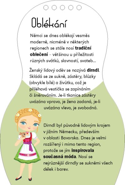 Další titul oblíbené série, která našla své obdivovatele v desítkách zemí světa, představuje malým čtenářům kouzlo Německa prostřednictvím panenky Hanny. Kreativní omalovánky, spousta samolepek… knížka obsahuje vše, co je třeba k vytvoření nesčetných modelů podle německé módy. A k tomu se děti dočtou i spoustu zajímavých informací navrch! Jak se jejich vrstevníci v Německu zdraví, jak se tam učí, na jakých specialitách si pochutnávají? Víte, co je to šukrut nebo jak vypadá dirndl? To a ještě mnohem víc se dozvíte, vydáte-li se za poznáním s našimi panenkami. A ke každé knížce dostanete krásný náramek pro štěstí!