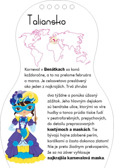 Další titul oblíbené série, která našla své obdivovatele v desítkách zemí světa, představuje malým čtenářům modely, které se oblékají na karnevaly konané v různých koutech světa. Kreativní omalovánky, spousta samolepek… knížka obsahuje vše, co je třeba k vytvoření nesčetných rób na karneval. A k tomu se děti dočtou i spoustu zajímavých informací navrch! Kdy a kde se konají nejznámější světové karnevaly, jak probíhá karnevalové veselí, průvody a další akce spojené s těmito událostmi? To a ještě mnohem víc se dozvíte, vydáte-li se za poznáním s našimi panenkami. A ke každé knížce dostanete krásný náramek pro štěstí!