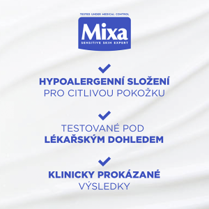 Mixa obnovující tělová péče i pro pokožku se sklonem k atopii má jemné složení obohacené o pathenol, glycerin a omega 6 a 9. Nemastná textura se rychle vstřebává do pokožky. Zmírňuje pocit 4 příznaků pokožky se sklonem k atopii: svědění, zarudnutí, drsnost a suchost.