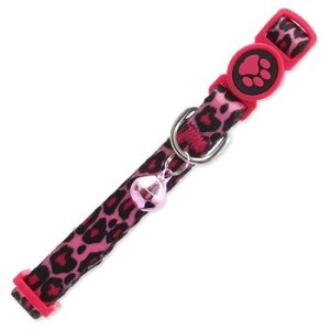 Nastavitelný nylonový obojek s leopardím potiskem a rolničkou.