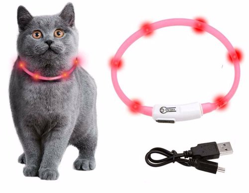 Odolný a svítící obojek pro kočky v sobě skrývá LED diody, které mohou nepřetržité svítit nebo blikat. Viditelnost až 500m. Obojek lze zastřihnutím zkrátit na libovolný obvod krku, je voděodolný. Nabíjí se pomocí USB kabelu .