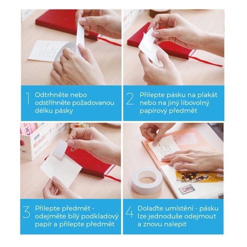 Silně lepicí oboustranná samolepicí páska s možností opakovaného použití. Vhodná na plakáty, fotografie, aranžování apod.