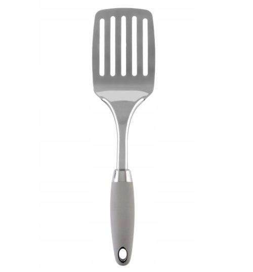Nerezová kuchyňská obracečka se sot touch rukojetí a očkem na zavěšení. Materiál neret 430 a PP+TPR rukojeť. Délka 30 cm, šířka 8 cm. Barva rukojeti dle skladové dostupnosti. EAN 5902041308082