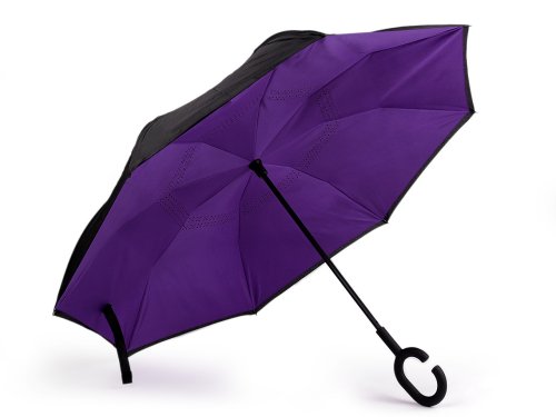 Obrácený deštník s okrasně perforovaným vnitřním potahem má revoluční řešení konstrukce. Díky opačnému otevírání a zavírání deštníku směrem vzhůru voda zůstane schovaná uvnitř v deštníku. Je to veliká výhoda např. když usedáte do automobilu, voda na vás již při zavírání nesteče, ale zůstane v deštníku. Jistě oceníte i jeho praktické sušení. Deštník sám stojí, stačí jej postavit na vhodné místo a voda sama steče ven, deštník už nemusíte rozevírat. Rukojeť ve tvaru C umožňuje deštník zaháknout přímo na paži, vaše ruce zůstanou volné např. k telefonování. Deštník má klasickou tyč zakončenou pevnou pogumovanou soft touch rukojetí ve tvaru C. Má dvojitý potah, spodní má odvětrávání. Skládá se z 8 výsečí. Díky dvojité konstrukci, která je schovaná mezi potahy, má deštník vysokou pevnost a stabilitu. [Deštníky založené na stejném principu, jen v jiných designech, najdete také na kartě 530028.]