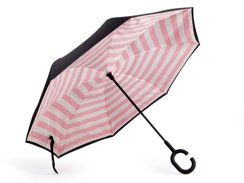 Obrácený deštník s barevným vnitřním potahem má revoluční řešení konstrukce. Díky opačnému otevírání a zavírání deštníku směrem vzhůru voda zůstane schovaná uvnitř v deštníku. Je to veliká výhoda např. když usedáte do automobilu, voda na vás již při zavírání nesteče, ale zůstane v deštníku. Jistě oceníte i jeho praktické sušení. Deštník sám stojí, stačí jej postavit na vhodné místo a voda sama steče ven, deštník už nemusíte rozevírat. Deštník má klasickou tyč zakončenou pevnou pogumovanou soft touch rukojetí ve tvaru C, která umožňuje deštník zaháknout přímo na paži, vaše ruce tak zůstanou volné např. k telefonování. Má dvojitý potah, spodní má odvětrávání. Skládá se z 8 výsečí. Díky dvojité konstrukci, která je schovaná mezi potahy, má deštník vysokou pevnost a stabilitu.