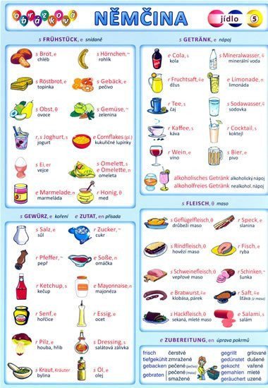 Ilustrovaný slovník zpracovaný dle jednotlivých témat. Názorné ilustrace pomáhají zapamatovat si nová slovíčka. 124 německých slovíček - potraviny, nápoje, úprava pokrmů, balení, stolování, jídla, chutě, 13 frází. Tvary singuláru a plurálu.
