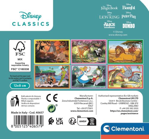 Sada 6 obrázkových kostek od Clementoni s motivem Disney classic. Lze sestavit 6 různých obrázků dle předlohy nebo využít ke klasické hře s kostkami, ke stavbě komínů a věží. Ideální pro stimulaci pozorovacích schopností, stejně jako logické a manuální dovednosti. Kostky jsou vyrobeny ze 100% recyklovaných a recyklovatelných materiálů. Rozměr balení: 13x12x4,5 cm. Věk 2+