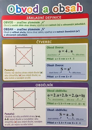 S tímto přehledem vzorců pro výpočet obvodů a obsahů zvládneš matematiku hravě. - čtverec - obdélník - trojúhelník - pravoúhlý trojúhelník - kosočtverec- rovnoběžník - lichoběžník - kruh - kružnice - pravidelný mnohoúhelník. Pythagorova věta. Příjemný A4 formát složený na A5, vhodný do třeba do sešitu.