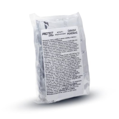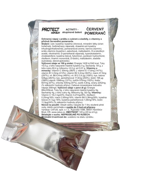 Ochranný nápoj MONzun PROTECT ACTIVITY - nealkoholický slabě mineralizovaný ochranný pracovní nápoj v prášku slazený cukrem a sladidly, obohacený vitaminy, s příchutí červeného pomeranče