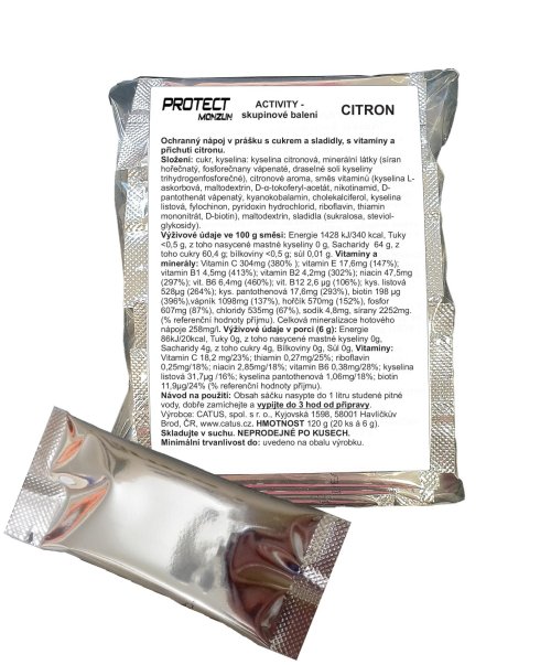 Ochranný nápoj MONzun PROTECT ACTIVITY - nealkoholický slabě mineralizovaný ochranný pracovní nápoj v prášku slazený cukrem a sladidly, obohacený vitaminy, s citronovou příchutí