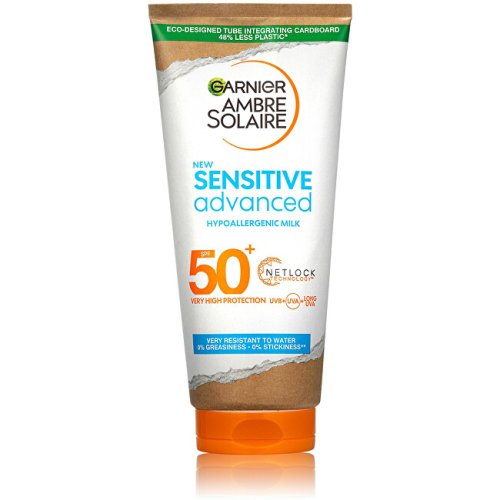 Opalovací mléko s velmi vysokou ochranou na citlivou pokožku s OF 50+ Ambre Solaire Sensitive Advanced spolehlivě ochrání citlivou pokožku, rychle se vstřebává a je voděodolné. Mléko je vhodné na tělo i tvář. Bez parfemace, testováno pod dermatologickou kontrolou. Výzkum opalovací kosmetiky Garnier je uznáván Britskou kožní nadací British Skin Foundation.