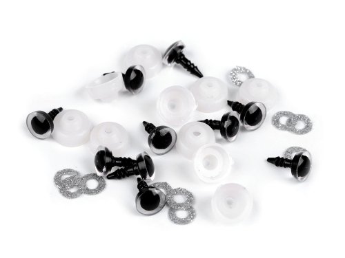 Polokulaté oči s glitrovou duhovkou se krásně třpytí. Umocní výraz vašich nejrůznějších postaviček či zvířátek. Mají závit, na který se nasadí duhovka, následně se provleče materiálem, a z druhé strany se pak nacvakne pojistka, která oči bezpečně připevní na místo. Pokud nebudete chtít, aby se oči třpytily, nemusíte duhovku použít, v tom případě zůstane duhovka transparentní. 1 sada = 1 oko + 1 třpytivá duhovka + 1 pojistka Délka vrutu je 1 cm. Na zacvaknutí pojistky je nutné vynaložit větší sílu.