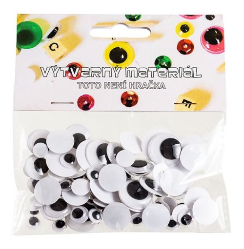 balení obsahuje 75ks očí s pohyblivou zorničkou oči mají čtyři různé velikosti (8, 10, 15 a 20 mm) oko je bíle s černou zorničkou