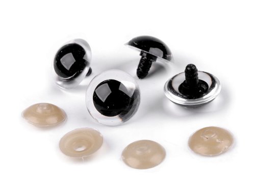 Velké polokulaté oči s barevnou duhovkou využijete při výrobě nejrůznějších postaviček či zvířátek. Mají závit, který se provleče materiálem, a z druhé strany se pak nacvakne pojistka, která oči bezpečně připevní na místo. 1 sada = 1 oko + 1 pojistka Délka vrutu je 1,1 cm.