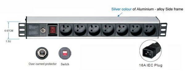 19" rozvodný panel 1U, 7x 220V napájecí kabel s koncovkou IEC 16A (230V/M 16A C19, IEC60320) Koncovka C19