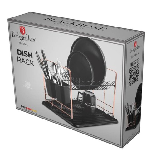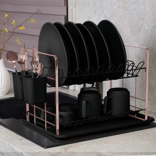 Prakticky vybavený odkapávač na nádobí z kolekce Black Rose Collection <BR>- vyrobený v kombinaci chromované oceli a PP plastu <BR>- celkem 2 patra pro odkládání umytého nádobí, horní s profilací na talíře a spodní rovný <BR>- na straně dvě přihrádky na příbory a kuchyňské náčiní <BR>- důležitou součástí je odkapávací tác na vodu <BR>- tradiční doplněk do kuchyně navíc v atraktivním provedení <BR>- rozměry: průměr 48 x 32 x výška 29 cm <BR>- barva: černá/růžovo-zlatá <BR>