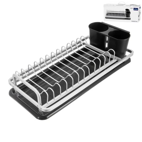 Odkapávač s plastovým tácem a odkapávačem na příbory je kombinován se stojanem z hliníku s eloxovanou (oxidovanou) povrchovou vrstvou, která chrání povrch hliníku před přirozenou oxidací a korozí.