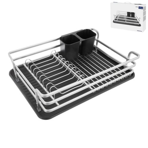 Odkapávač s plastovým tácem a odkapávačem na příbory je kombinován se stojanem z hliníku s eloxovanou (oxidovanou) povrchovou vrstvou, která chrání povrch hliníku před přirozenou oxidací a korozí.