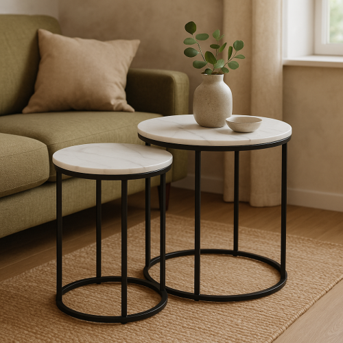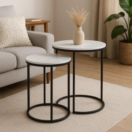 Stylová sada dvou odkládacích stolků v designu matného bílého mramoru. Kombinace pevné železné konstrukce a odolné MDF desky dodává interiéru elegantní a moderní vzhled. Ideální jako doplněk do obývacího pokoje, ložnice či pracovny.