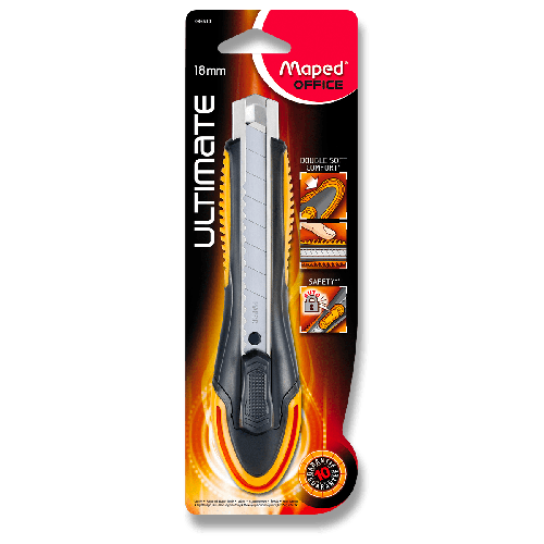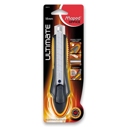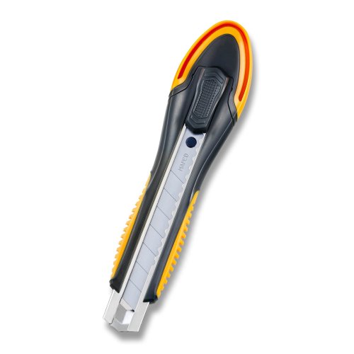 Odlamovací nůž se speciálně upraveným úchopem pro pohodlné držení jak v místě dlaně, tak v místě položení ukazováčku. Zatahovatelné odlamovací břity o šíři 18 mm, integrovaná pojistka. Záruka 10 let.