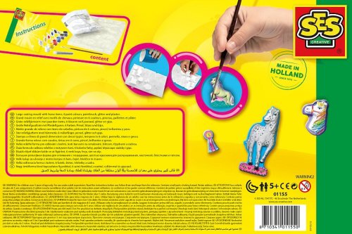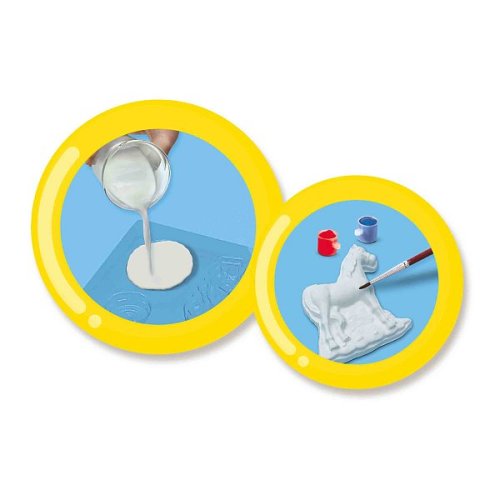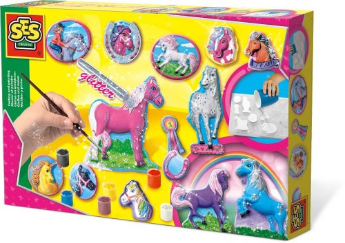 Sada pro výrobu sádrových odlévaných figurek Fantasy koní. Odlijte sádru do velké formy, nechte ji ztvrdnout a poté koně namalujte těmi nejkrásnějšími barvami. Nakonec své výtvory rozzáříte třpytkami a dodáte jim jedinečný vzhled. Rychleschnoucí sádra, zářivé barvy s výbornou kryvostí a třpytivé akcenty dodají vašim výtvorům kouzlo. Barvy i sádra jsou snadno omyvatelné z pokožky i textilu – ideální pro kreativní hraní bez starostí. Obsah sady: sádra, plastová forma s motivy koní, 6 kelímků s barvou, štětec, stříbrné třpytky a návod k použití. Rozměry balení: 20 x 30 x 4 cm. Nevhodné pro děti do 3 let. Věk: 5+