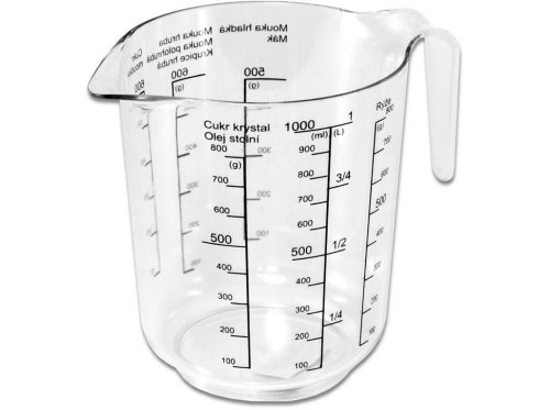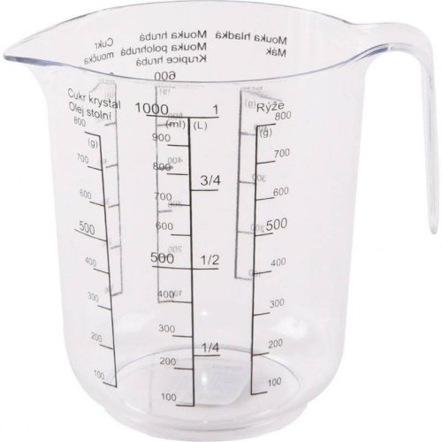 Odměrka s uchem a potiskem, který vám pomůže naměřit správné množství tekutin v ml, cukru, mouky .